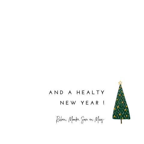 Sfeervolle kerstkaart met kerstboom en teksten in goudfolie look